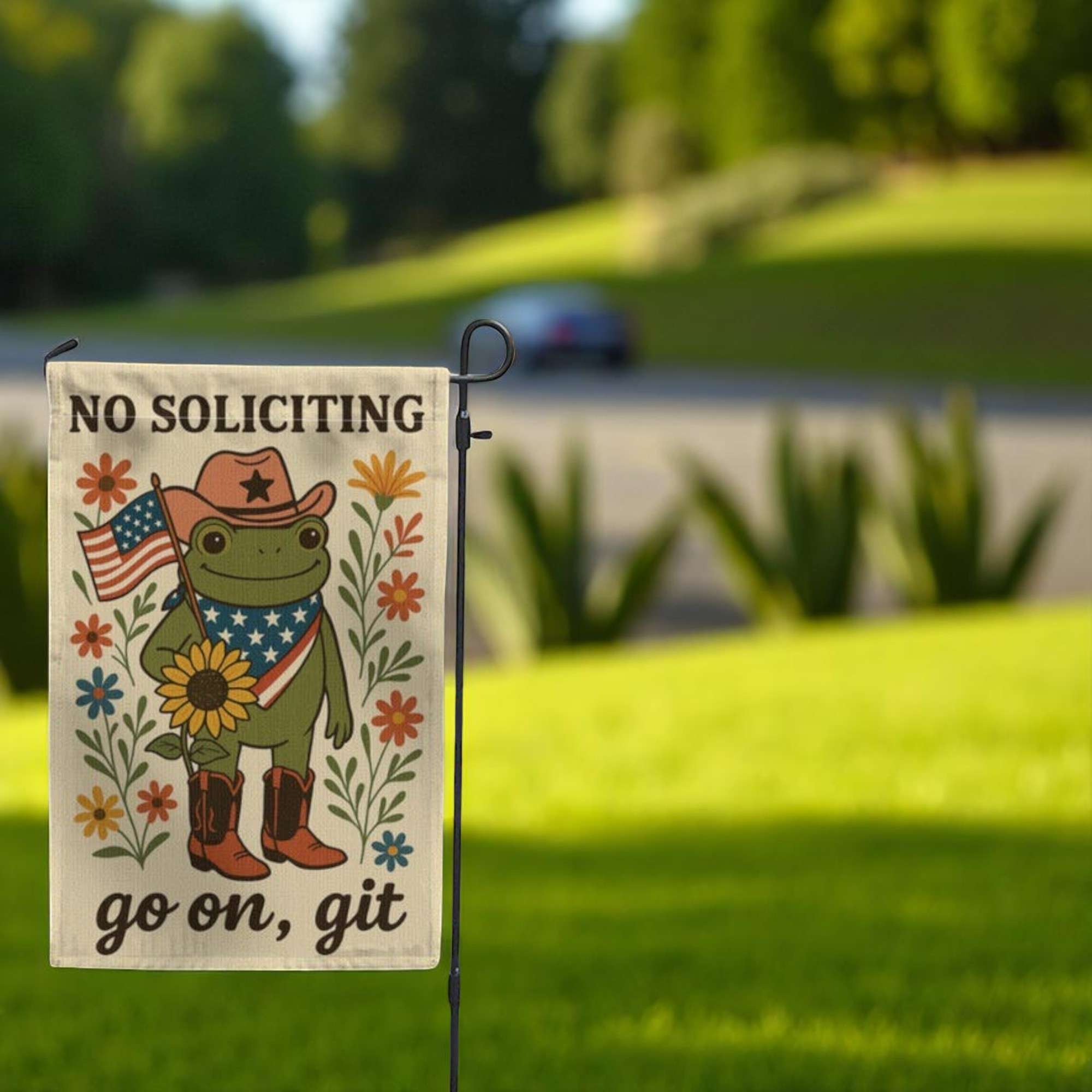 Add a dose of humor to your outdoor space with this Funny No Soliciting Garden Flag, designed to make visitors smile—or think twice before knocking. Perfect for front yards, gardens, or walkways, this eye-catching flag features a charming frog and playful message that clearly says: “Go on, git!”