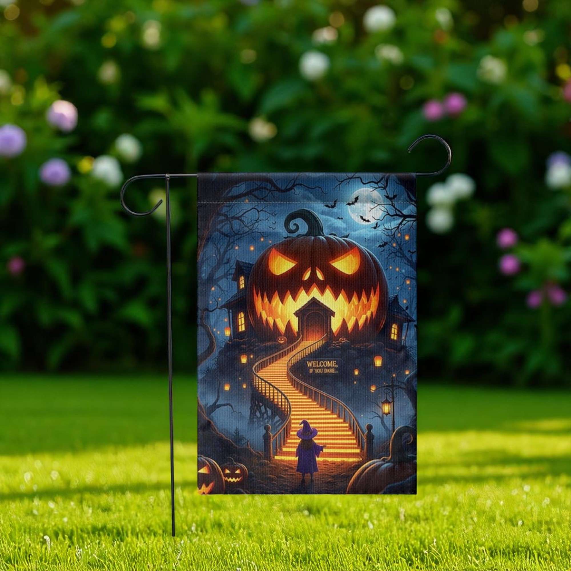 Elevate your outdoor decor this season with our Halloween Garden Flag, Haunted Pumpkin Yard Decor. This charming flag captures the spooky spirit of Halloween with a beautifully designed haunted pumpkin house, perfect for welcoming guests and adding festive flair to your yard or garden.