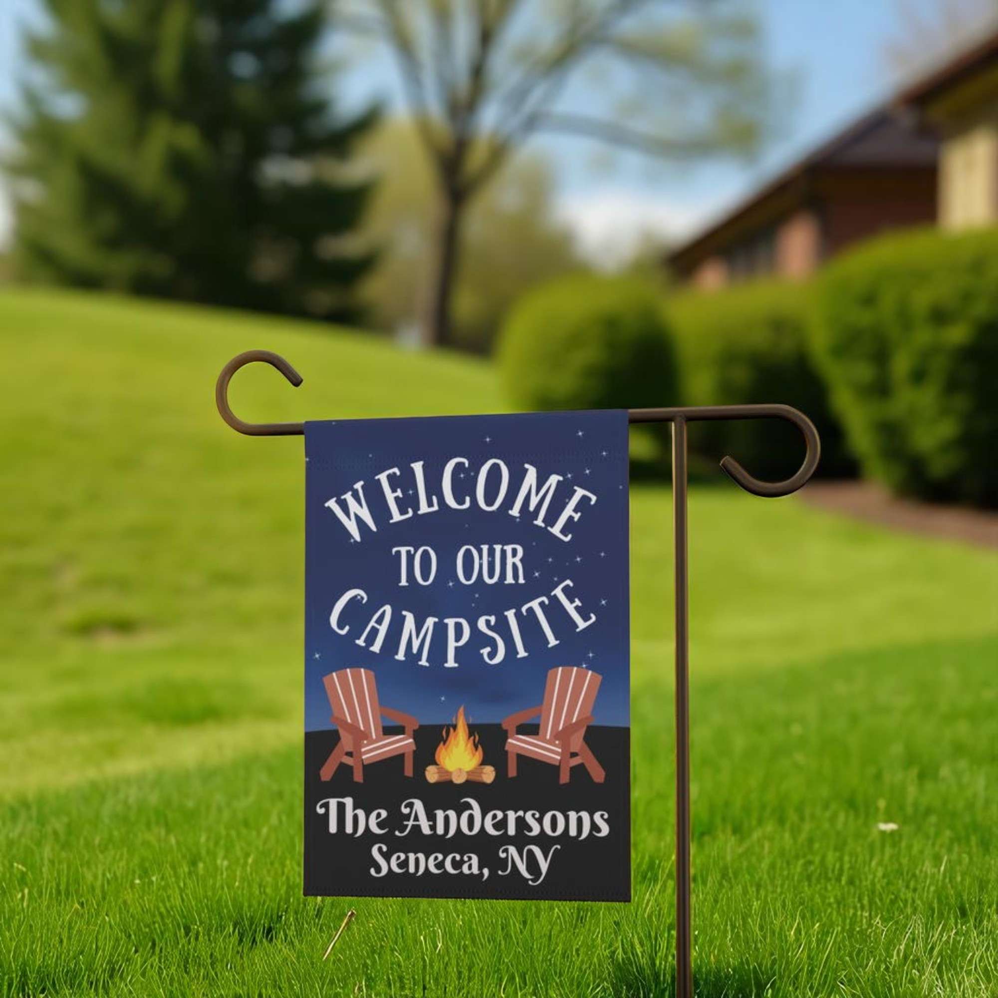 Welcome to the perfect way to personalize your outdoor experience with our Personalized Campsite Flag. Crafted for camping enthusiasts and RV owners alike, this custom flag adds a warm, inviting touch to your campsite or garden space, making every outdoor stay feel special and uniquely yours.