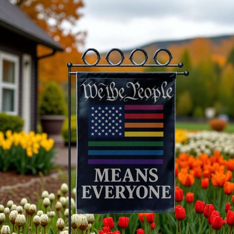 - Inclusive Design: Features a bold \”We The People Means Everyone\” message with diverse LGBTQ colors to represent all identities.